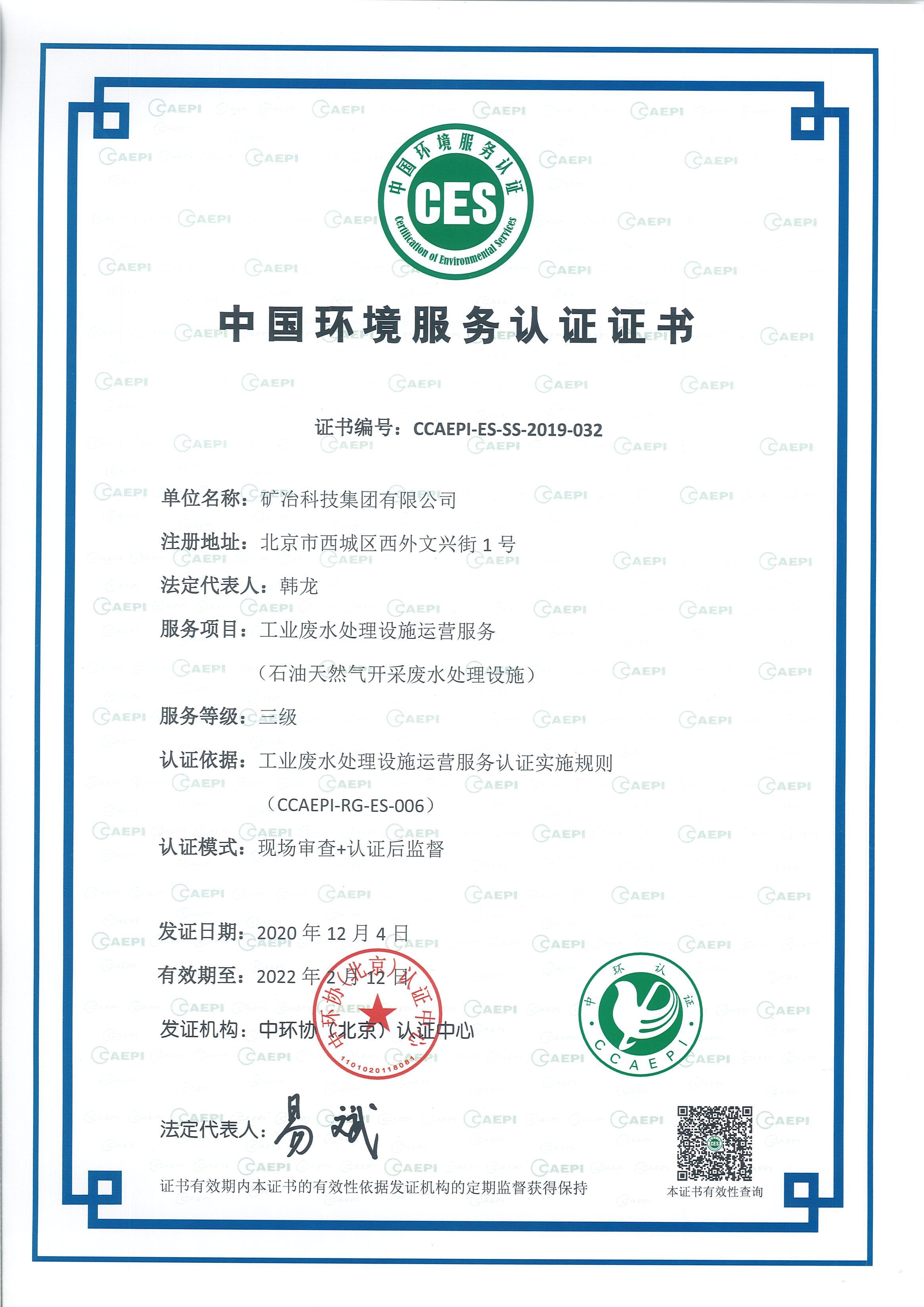 中國環境服務認證證書