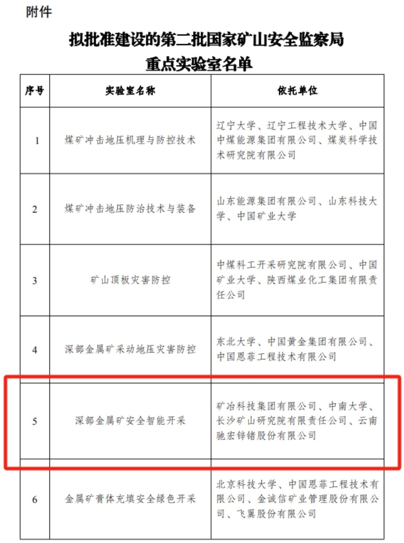 近日,國家礦山安全監(jiān)察局發(fā)布《國家礦山安全監(jiān)察局關(guān)于批準(zhǔn)建設(shè)第二批重點(diǎn)實(shí)驗(yàn)室的通知》(礦安函〔2024〕33號),全國共有13家實(shí)驗(yàn)室獲批。由礦冶集團(tuán)牽頭,聯(lián)合中南大學(xué)、長沙礦山研究院有限責(zé)任公司、云南馳宏鋅鍺股份有限公司申報(bào)的“深部金屬礦安全智能開采國家礦山安全監(jiān)察局重點(diǎn)實(shí)驗(yàn)室”成功獲批。這是礦冶集團(tuán)牽頭建設(shè)的第一個(gè)國家礦山安全監(jiān)察局重點(diǎn)實(shí)驗(yàn)室(國家部委級),體現(xiàn)了礦冶集團(tuán)在金屬礦產(chǎn)資源深部開采領(lǐng)域的創(chuàng)新實(shí)力和領(lǐng)先地位,是礦冶科研平臺建設(shè)的又一重要成果。